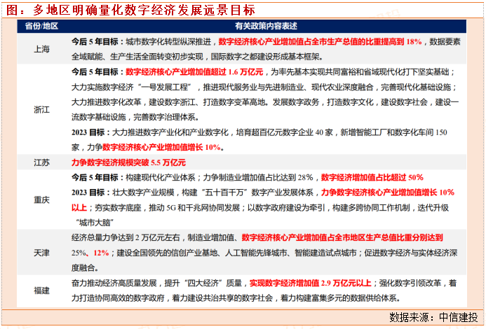 数字经济依然是今年地方重要会议的“高频词”。据我们统计,今年31个省份均对数字经济发展作出部署,其中21省份设定了未来1-5年数字经济规模/占比/增速的具体目标。