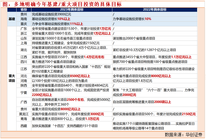 而重大项目,仍是地方稳投资的重要抓手。一方面,约6成省份确定重大项目具体目标。据我们统计,广东、浙江、江西、山东等19个省今年明确了基建/重大项目投资的具体数额或增速。其中广东、浙江等7省是在去年未设定目标的情况下,今年明确了具体目标;江西、黑龙江等省份今年目标投资额明显增长,如江西今年重大项目“年度投资1.6万亿元左右”,较去年目标同比增长45%。