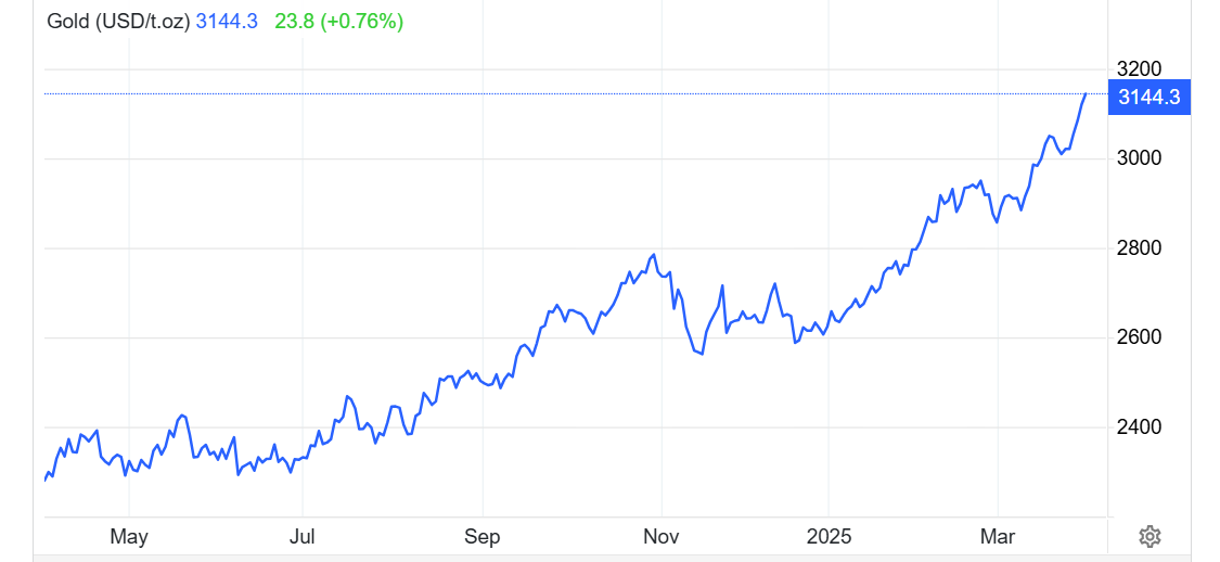 黄金站上3100美元高位! 华尔街坚定看多:麦格理押注Q3直奔3500! 高盛豪言年底有望冲破4000!