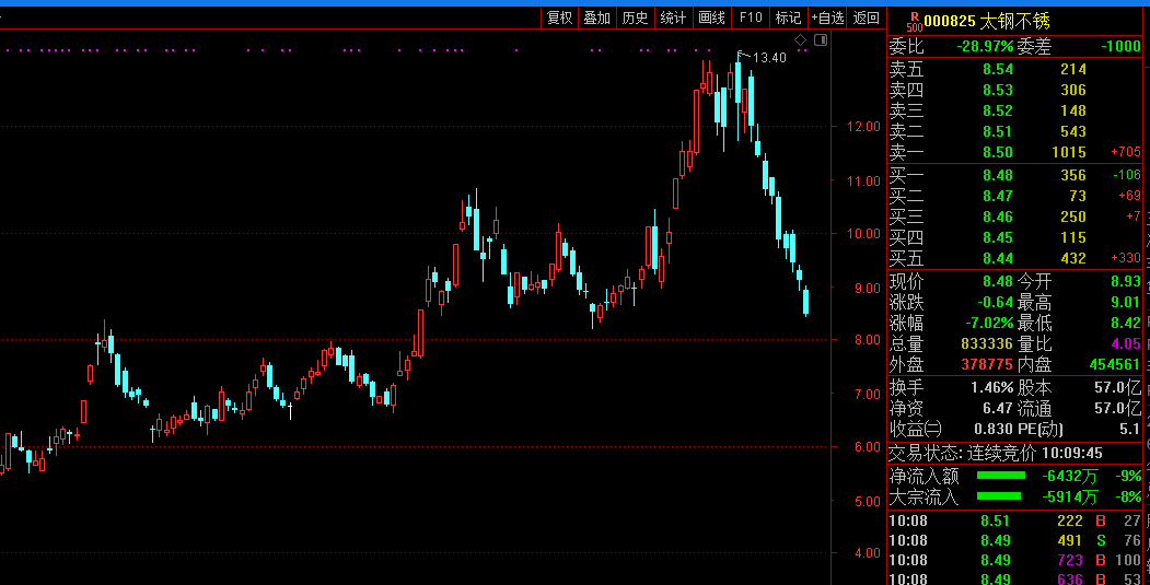 10月12日早盘,太钢不锈大跌7%。截至发稿报8.48元,跌7.02%,为连续9个交易日下跌,期间累计跌幅超过30%。