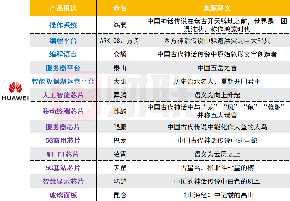 观察华为的硬件产品命名规则,服务器芯片鲲鹏、5G芯片巴龙、移动终端芯片麒麟、智慧显示芯片鸿鹄以及未列出的乘黄、青鸟、当康、灵豸、饕餮、毕文等均出自于《山海经》描述的上古异兽。