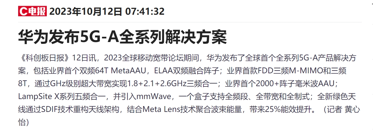 据科创板日报周四报道,2023全球移动宽带论坛期间,华为发布了全球首个全系列5G-A产品解决方案,包括业界首个双频64T MetaAAU,ELAA双频融合阵子等。