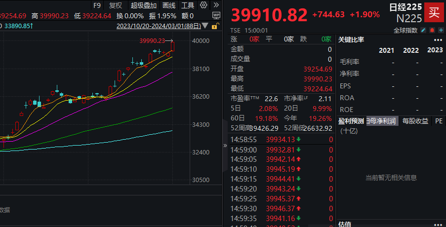 3月1日,日经225指数收盘涨1.9%,报39910.82点,盘中最高触及39990点,日内一度涨超2%,再度刷新历史新高。年内,日经225指数累计上涨近20%。