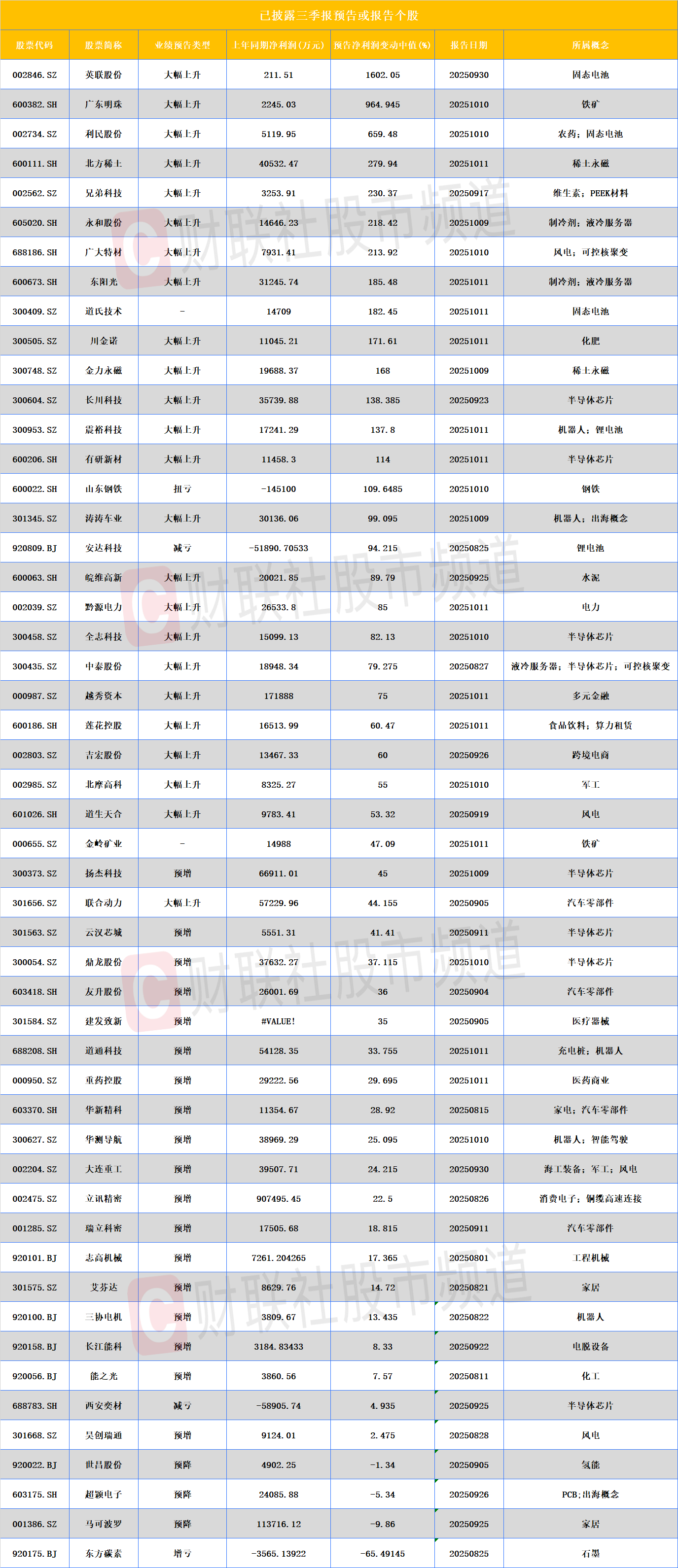 上表按净利润变动中值排序列出了已披露三季报预告或报告的个股情况,其中英联股份2025年前三季度净利润预计同比增长1531.13%–1672.97%暂居首位,此外广大特材、永和股份、兄弟科技、北方稀土、利民股份、广东明珠等个股前三季度净利预增超200%。