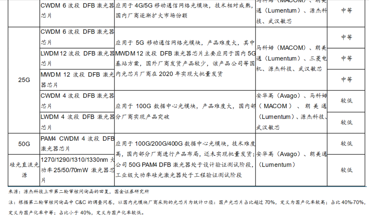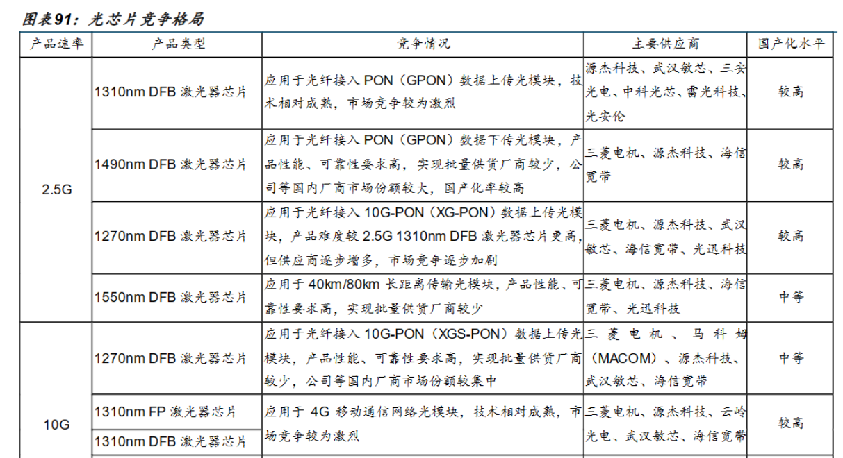 海外光芯片厂商具备先发优势,国内厂商乘本土替代东风正迎头赶上。国金证券分析师樊志远等5月13日发布的研报指出,我国光芯片产业参与者主要包括海外头部光通信厂商、国内专业光芯片厂商及国内综合光芯片模块厂商。其中,国内专业光芯片厂商包括源杰科技、武汉敏芯、中科光芯、雷光科技、光安伦和云岭光电等;国内综合光芯片模块厂商或拥有独立光芯片业务板块厂商包括光迅科技、海信宽带、索尔思、三安光电和仕佳光子等。从竞争格局和产品布局看,以住友电工、马科姆(MACOM)、博通(Broadcom)为代表的欧美日综合光通信企业在高速率光芯片市场占据主导地位,而中国厂商在中低速率芯片市场占据优势,国产化率较高,但高速光芯片仍存在差距。