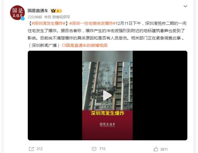此前,据深圳新闻广播报道,12月11日下午,深圳湾悦府二期的一间住宅发生了爆炸。据目击者称,爆炸产生的冲击波强烈到附近的地标建筑春笋也受到了影响。目前尚不清楚爆炸的具体原因和是否有人员受伤。相关部门正在紧急调查此事 。