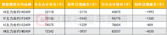 四大期指主力合约多空双方均减仓,IH、IF、IC合约多头减仓数量较多,IM合约空头减仓数量略多。