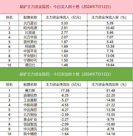主力资金流出前十的个股所属板块较为杂乱,赛力斯净流出居首。
