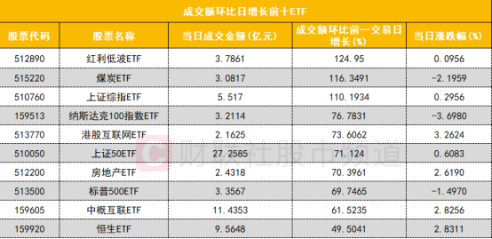 ②成交额环比昨日增长前十的ETF中,红利低波ETF(512890)成交额环比增长124%位居首位。