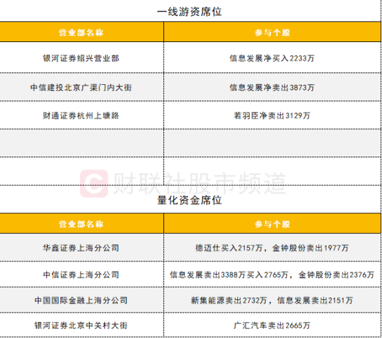 量化资金活跃度有所提升,但上榜个股多为卖出,金钟股份遭两家量化席位卖出,信息发展遭一家量化席位做T。