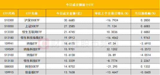 从成交额前十的ETF来看,沪深300ETF(510300)成交额位居首位,三只恒生指数ETF和三只纳指ETF位居前十行列。