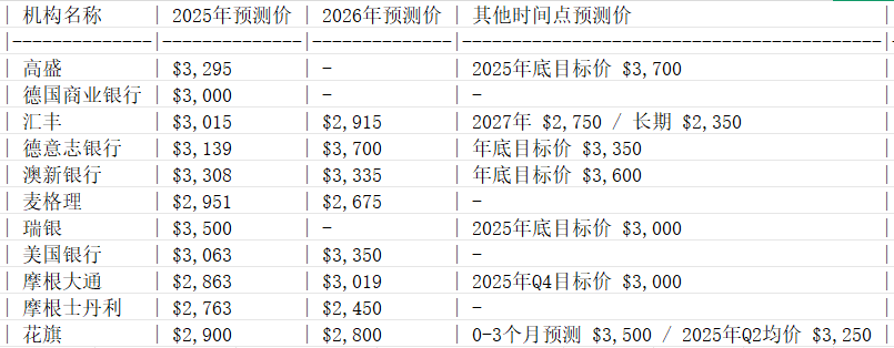 以下是各机构对2025-2026年金价的最新预测(美元/盎司):