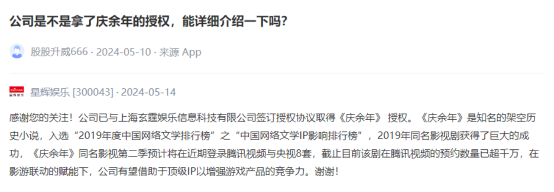 星辉娱乐5月14日在互动易上回复提问表示,公司已与上海玄霆娱乐信息科技有限公司签订授权协议取得《庆余年》授权,并计划于2024年推出《庆余年》游戏产品。
