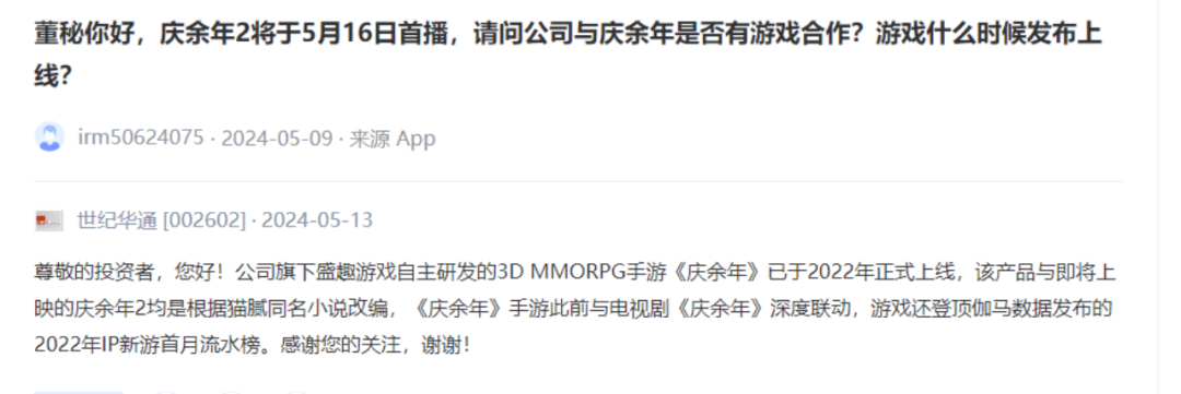 不仅是星辉娱乐,世纪华通也在互动易上表示,公司旗下盛趣游戏自主研发的3D MMORPG手游《庆余年》已于2022年正式上线,该产品与即将上映的《庆余年2》均是根据猫腻同名小说改编,《庆余年》手游此前与电视剧《庆余年》深度联动,游戏还登顶伽马数据发布的2022年IP新游首月流水榜。