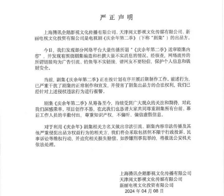 今年4月8日,庆余年官微就曾发布一份严正声明,称发现部分网络平台大量传播所谓“《庆余年第二季》送审剧集内容”,并发现有围绕剧集编造和杜撰大量不实消息的情况。经核查,网络流传的所谓链接均为广告引流、钓鱼等不实链接,请网友不要轻信,保护个人信息和钱财安全。