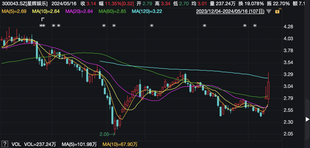 在《庆余年》相关消息的带动下,5月15日和16日,星辉娱乐的股价有着明显变动。其中5月15日的涨幅超过11%,而5月16日盘中涨幅一度超过18%,截至收盘,星辉娱乐涨幅达到11.35%。