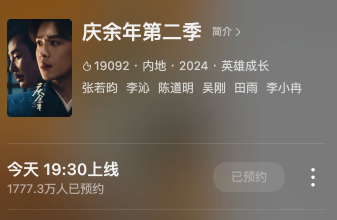 因此,影迷和市场对《庆余年》第二季充满期待,《庆余年》第二季更是未播先火,不仅成为全网首部千万预约量级的电视剧,更被不少人“盯”上了。