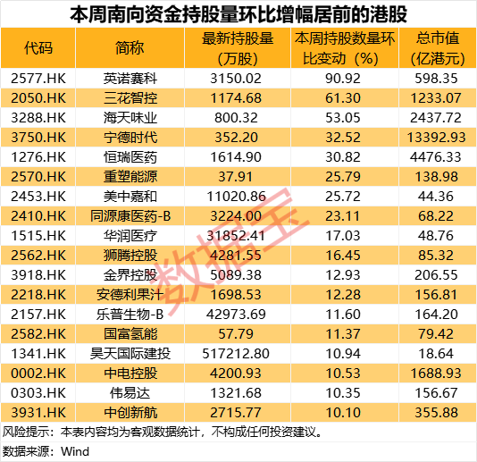 从持股量变化来看,本周18股获得南向资金持股量环比增长超10%。其中,英诺赛科、三花智控、海天味业持股量环比增长均50%以上,获得南向资金大幅度加仓;宁德时代、恒瑞医药持股量环比增长均在30%以上。