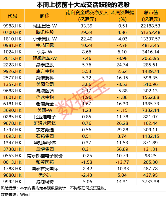 从一周前十大活跃个股来看,本周共有25只个股上榜,中芯国际本周港股通成交总额最高,达到251.04亿港元,腾讯控股、小米集团-W本周港股通买卖总额均超过200亿港元。