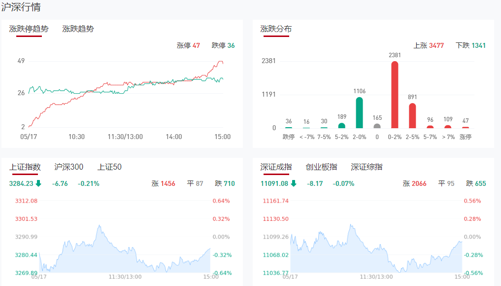 5月17日,大盘全天震荡调整,三大指数均小幅下跌。截至收盘,沪指跌0.21%,深成指跌0.07%,创业板指跌0.02%。总体上个股涨多跌少,两市超3400只个股上涨。沪深两市今日成交额7814亿,较上个交易日缩量849亿,成交金额持续萎缩。