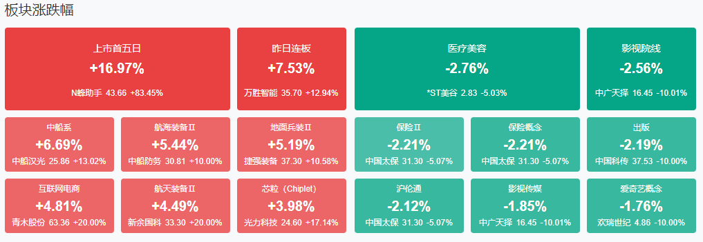 盘面上,军工股集体走强,中船系方向领涨,新余国科20CM涨停,中天火箭、长城军工、中船防务涨停。虚拟电厂、充电桩等赛道股继续活跃,迦南智能、大烨智能20CM涨停,杭州热电4连板。AI概念股迎来反弹,电商、CPO等方向领涨,青木股份、震有科技20CM涨停,联特科技再创新高,光迅科技、若羽臣等涨停。下跌方面,银行、保险等蓝筹股走势低迷,中国太保跌超5%,中国电信跌超4%。板块方面,中船系、电商、虚拟电厂、CPO等板块涨幅居前,教育、饮料制造、创新药、银行等板块跌幅居前。