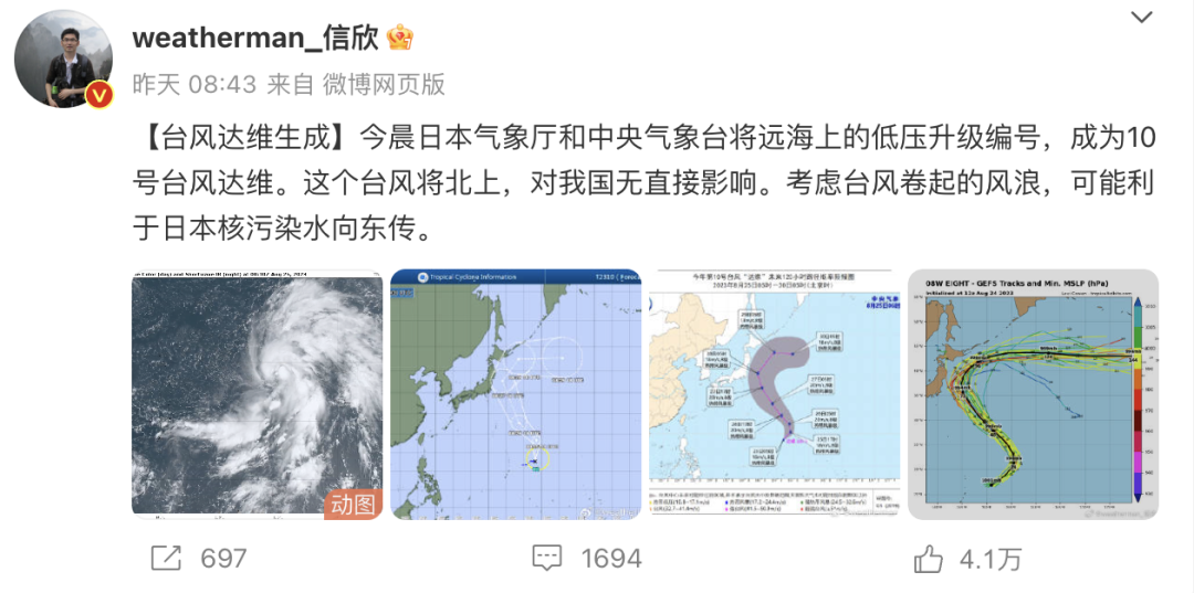 此外,中国气象频道气象分析师信欣表示,25日,日本气象厅和中央气象台将远海上的低压升级编号,成为10号台风达维。这个台风将北上,对我国无直接影响。考虑台风卷起的风浪,可能利于日本核污染水向东传。