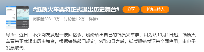 话题#纸质火车票将正式退出历史舞台#今日冲上热搜榜首,引发广泛关注。有网友称,没有“纸质票”记不住车次和座位号怎么办?也有网友担心,没有智能手机的老人怎么查看乘车信息?对此,中国铁路12306就相关问题作出回应。