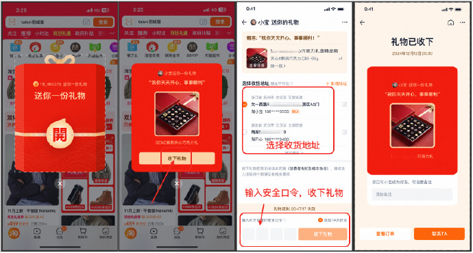 对于收礼物的人来说,可以复制分享链接到淘宝APP,点开礼物 -填写收货地址和安全口令- 收下礼物,等待物流运输,即可完成收礼物。对此,淘宝官方人工客服表示,“送礼物”功能近期刚推出的活动,活动是持续性的,目前还未接收到具体结束时间。