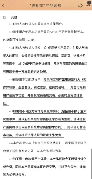 此外,根据淘宝“送礼物”产品须知,付款人与收货人均须为淘宝注册用户,淘宝用户使用本功能所需的App均已更新到最新版本,PC端暂不支持送礼功能。在使用本功能过程中,如果淘宝用户出现违规行为(如作弊领取、恶意套现、刷取信誉、虚假交易等),淘宝可限制用户使用本功能,并有权撤销违规交易,必要时追究法律责任。