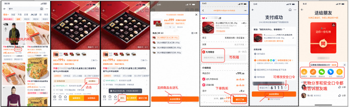 与微信的“蓝包”类似,淘宝也同样支持赠送的商品,只不过需要通过淘口令、二维码等方式分享给朋友。