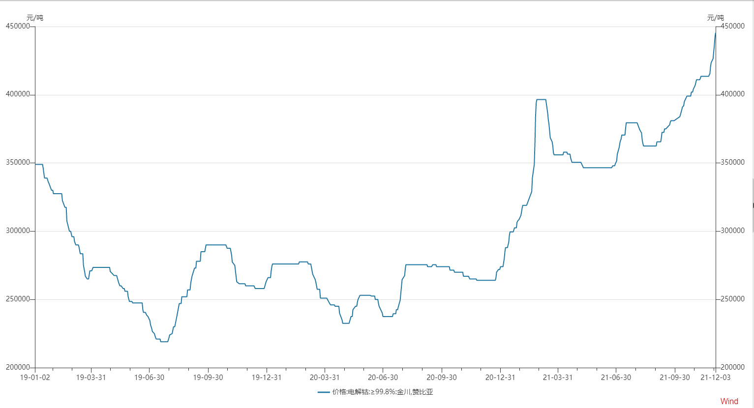 数据显示,12月3日,电解钴均价延续上涨态势,报445500元/吨,继续刷新3年以来高位。