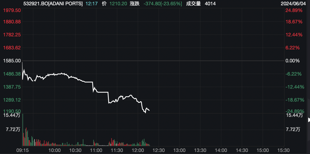 个股方面,印度阿达尼旗下公司AdaniPorts跌超23%,为2023年2月以来最大跌幅。