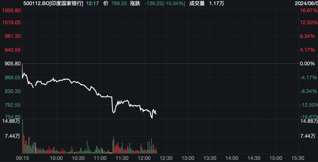 印度国家银行跌超15%,为2008年10月以来最大跌幅。