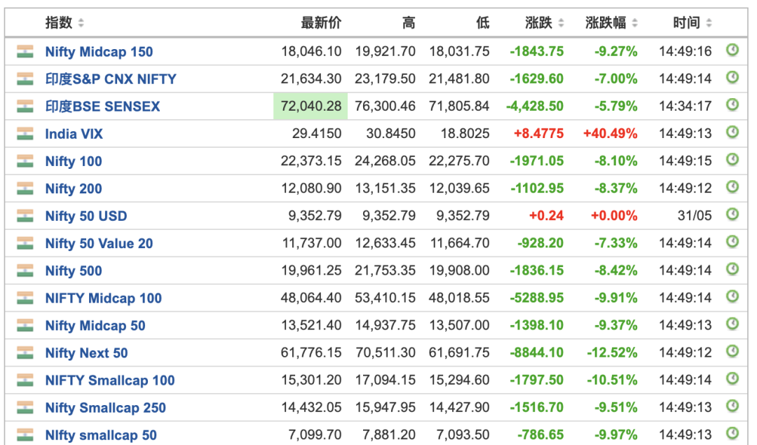 英为财情数据显示,印度主要股指均大幅下跌,与此同时,印度VIX恐慌指数跳涨,截至发稿涨超40%。