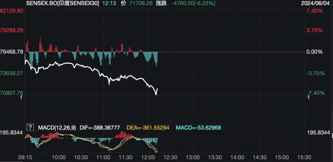 当地时间6月4日,印度股市开盘后持续走低。截至发稿,印度SENSEX30指数跌超6%,盘中一度跌超7%。