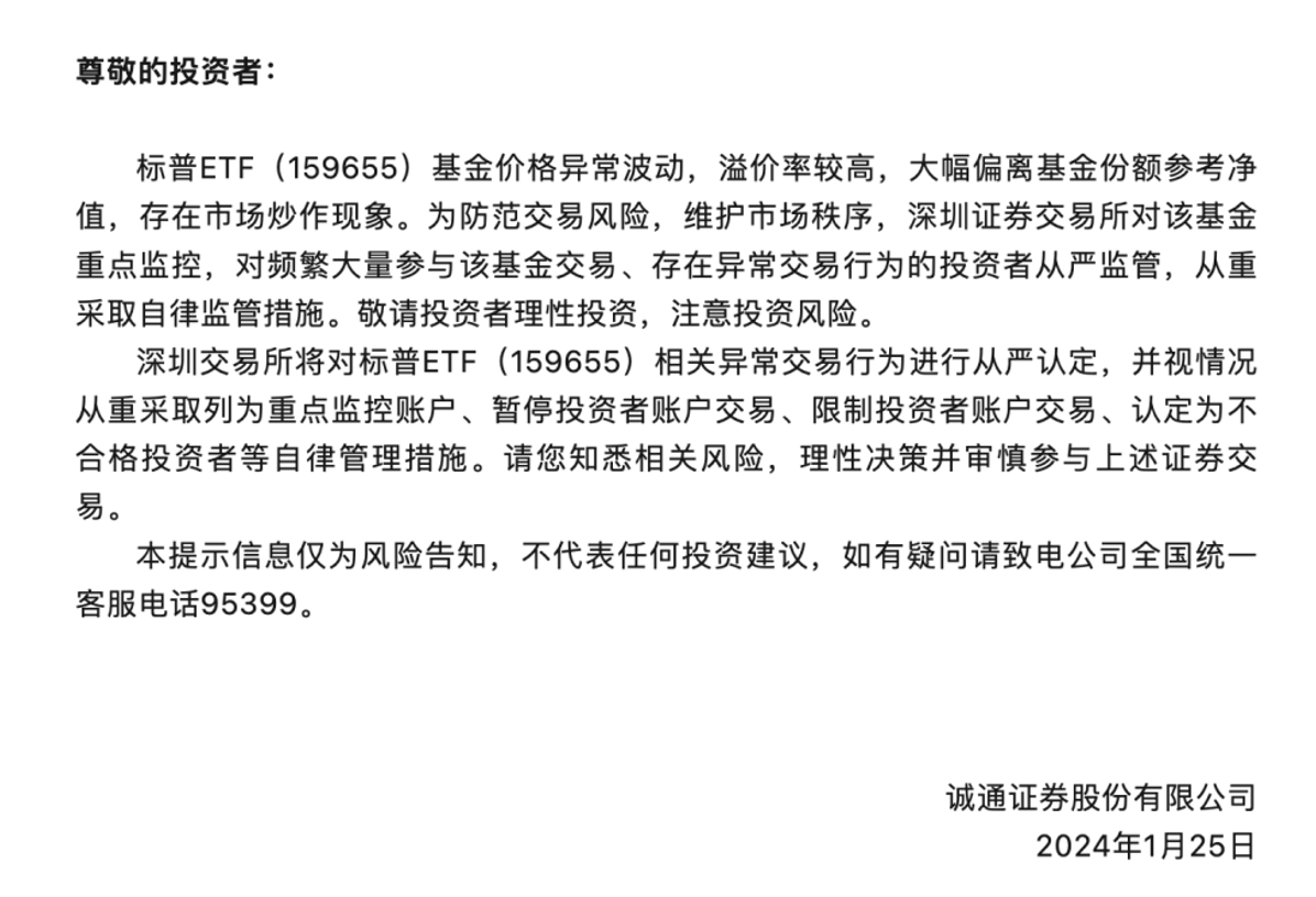 诚通证券的公告中明确道,深圳交易所将对标普ETF(159655)相关异常交易行为进行从严认定,并视情况从重采取列为重点监控账户、暂停投资者账户交易、限制投资者账户交易、认定为不合格投资者等自律管理措施。