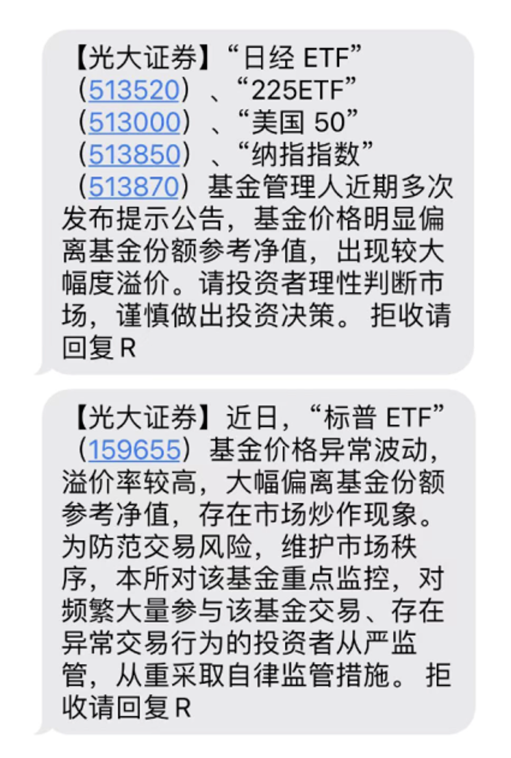 根据券商的风险提示,“日经ETF”“日经225ETF”“美国50ETF”“纳指指数”基金管理人近期多次发布提示公告,基金价格明显偏离基金份额参考净值,出现较大幅度溢价。光大证券提示投资者谨慎做出投资决策。