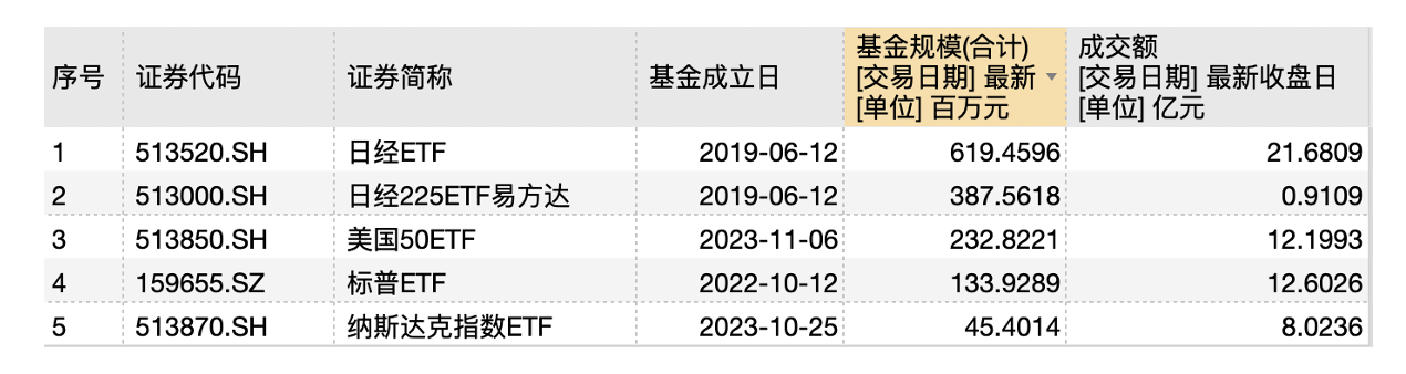 值得注意的是,“美国 50ETF”、 “纳指指数”是近期新成立的基金,分别于2023年11月、10月份成立,目前总规模并不是特别高。