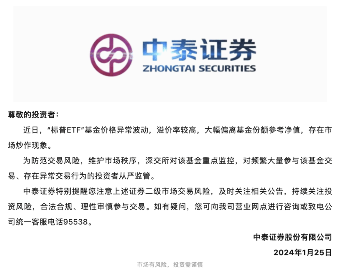 中泰证券发布公告称,“标普ETF”基金价格异常波动,溢价率较高,大幅偏离基金份额参考净值,存在市场炒作现象。为防范交易风险,维护市场秩序,深交所对该基金重点监控,对频繁大量参与该基金交易、存在异常交易行为的投资者从严监管。