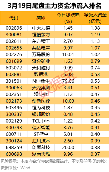 净流出方面,21股尾盘主力资金净流出超0.5亿元,其中4股尾盘主力资金净流出超1亿元。