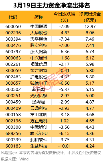 此外,还有大华股份、天孚通信、胜宏科技和浙大网新等个股主力资金净流出居前。
