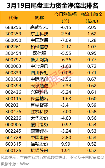 寒武纪-U尾盘主力资金净流出居首,达2.05亿元。东土科技、中国联通、拓维信息和深信服等尾盘主力资金净流出均超0.9亿元。