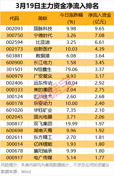 宁德时代主力资金净流入7.08亿元,居次席。消息面上,3月18日,宁德时代和蔚来同日宣布,双方在3月17日晚间签署战略合作协议,将共同打造全球最大换电网络,并推进行业技术标准的统一。根据协议,除了换电合作外,宁德时代正在推进对蔚来能源不超过25亿元的战略投资。受此消息影响,3月18日,蔚来港股股价最高涨超17%。