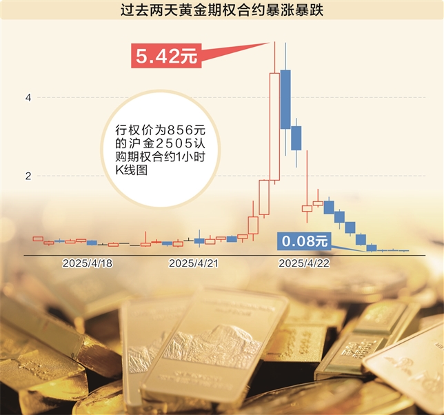 期权市场的“末日轮”效应,成为市场波动的重要推手。根据安排,沪金2505期权的到期日为4月24日。就在到期日前两天,4月22日,在金价创下新高的推动下,黄金期权交易量增加21万手至35万手,创历史新高。当天,行权价在856元到872元之间的沪金2505认购期权合约,当日盘中最高涨幅接近10倍。