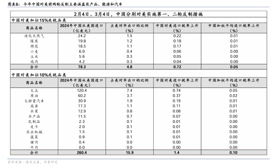 对需要从美国进口的商品而言,加征对美关税可能局部推升其价格,但反制措施对国内整体物价影响有限。商品方面,美进口占比高的机械设备、化工等行业、以及此前已加征关税的能源、农产品等行业价格上行幅度可能相对较高。