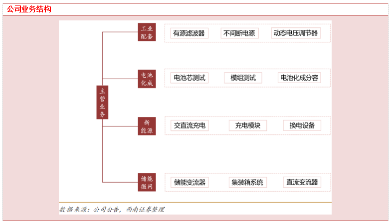 公司战略布局前瞻,产品竞争力突出,四大业务线齐头并进,储能+充电桩业务起量,电能质量基本盘稳固,电池化成检测绑定下游客户,整体业绩确定性较强。
