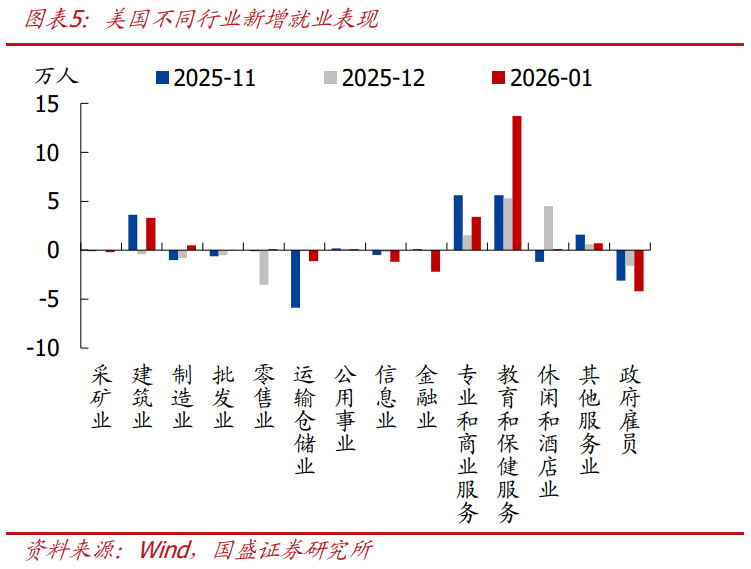 分项表现:从1月美国各行业就业来看,政府部门(-4.2万)就业仍较弱,私人部门(+17.2万)则出现明显改善,但改善面过于狭窄,教育和保健服务行业(+13.7万)贡献了近80%的新增就业,其次是专业和商业服务(+3.4万),建筑业(+3.3万),信息业(-1.2万)和金融业(-2.2万)则延续负增态势,制造业(+0.5万)时隔13个月再次实现正增。结构看,新增就业主要集中在教育医疗等需求相对刚性的服务部门,信息、金融等周期敏感型行业仍在收缩,制造业虽小幅转正但修复力度有限,这意味着当前美国非农就业改善更多依赖少数行业拉动,广泛扩散的就业回升尚未形成,但整体仍体现出一定的韧性。
