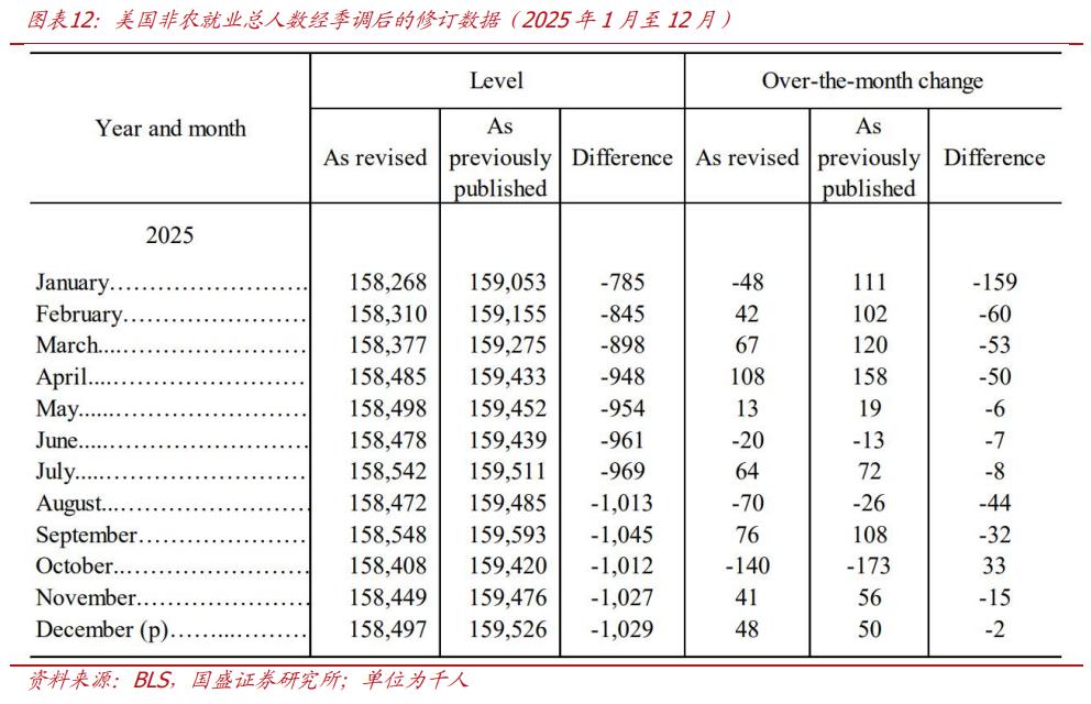 数据修正:年度数据修正后,未季调口径下,截至25年3月的非农就业总人数下修86.2万人,降幅为0.5%;过去10年基准修订绝对平均幅度为0.2%。经季节调整后,2025年非农就业总人数的变化由+58.4万人修正为+18.1万人。需要提示,在1月非农的企业调查中,BLS更新了其所使用的企业出生-死亡模型,以纳入每月最新的样本信息。本次CES方法调整将企业生死模型改为每月纳入新样本信息,可能使模型对当期就业变化更加敏感,在就业走强时可能放大对新增岗位的估计,因此,该行认为1月美国非农偏强除基本面因素支撑外,也可能受到了一定的技术性抬升影响,其对劳动力市场实际动能的反映有待进一步验证。