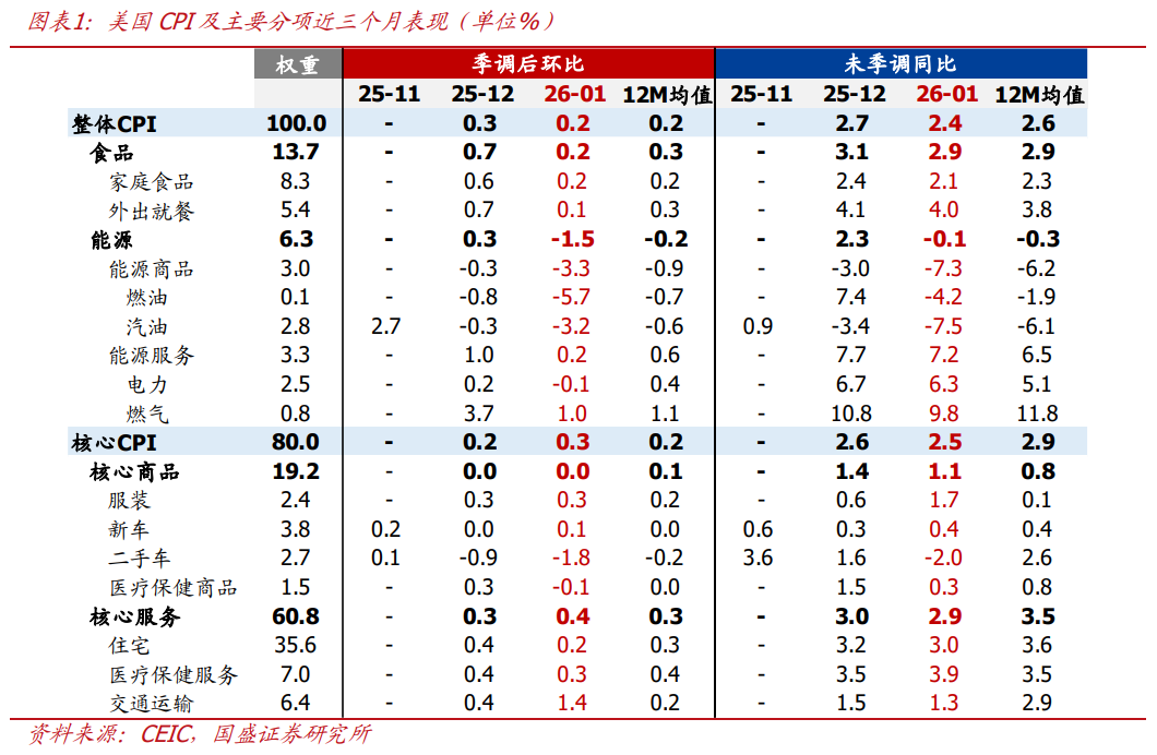 整体表现:美国2026年1月未季调CPI同比2.4%,低于预期和前值,相比25年9月连续3个月回落;核心CPI同比2.5%,持平于预期,低于前值。季调后CPI环比0.2%,低于预期,持平12个月均值0.2%;核心CPI环比0.3%,持平预期,高于12个月均值0.2%。