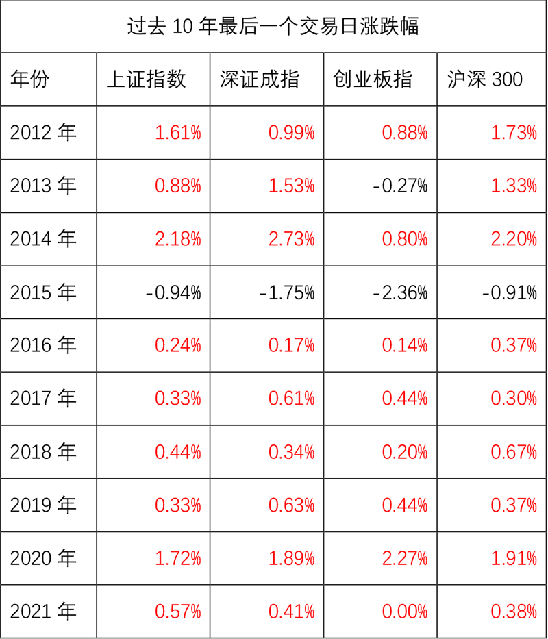 从过去10年的数据来看,每年的最后一个交易日基本上都是收涨,沪深300、上证指数以及深证成指更是仅在2015年的最后一个交易日下跌,上涨概率高达90%。
